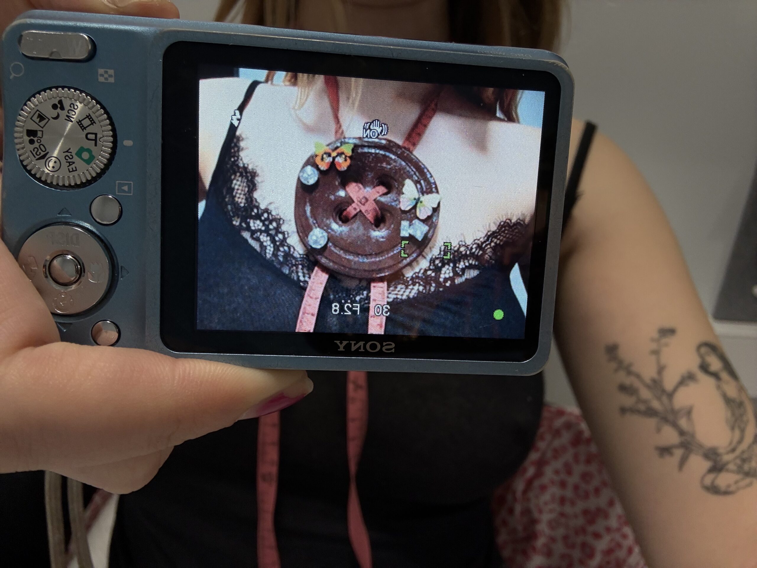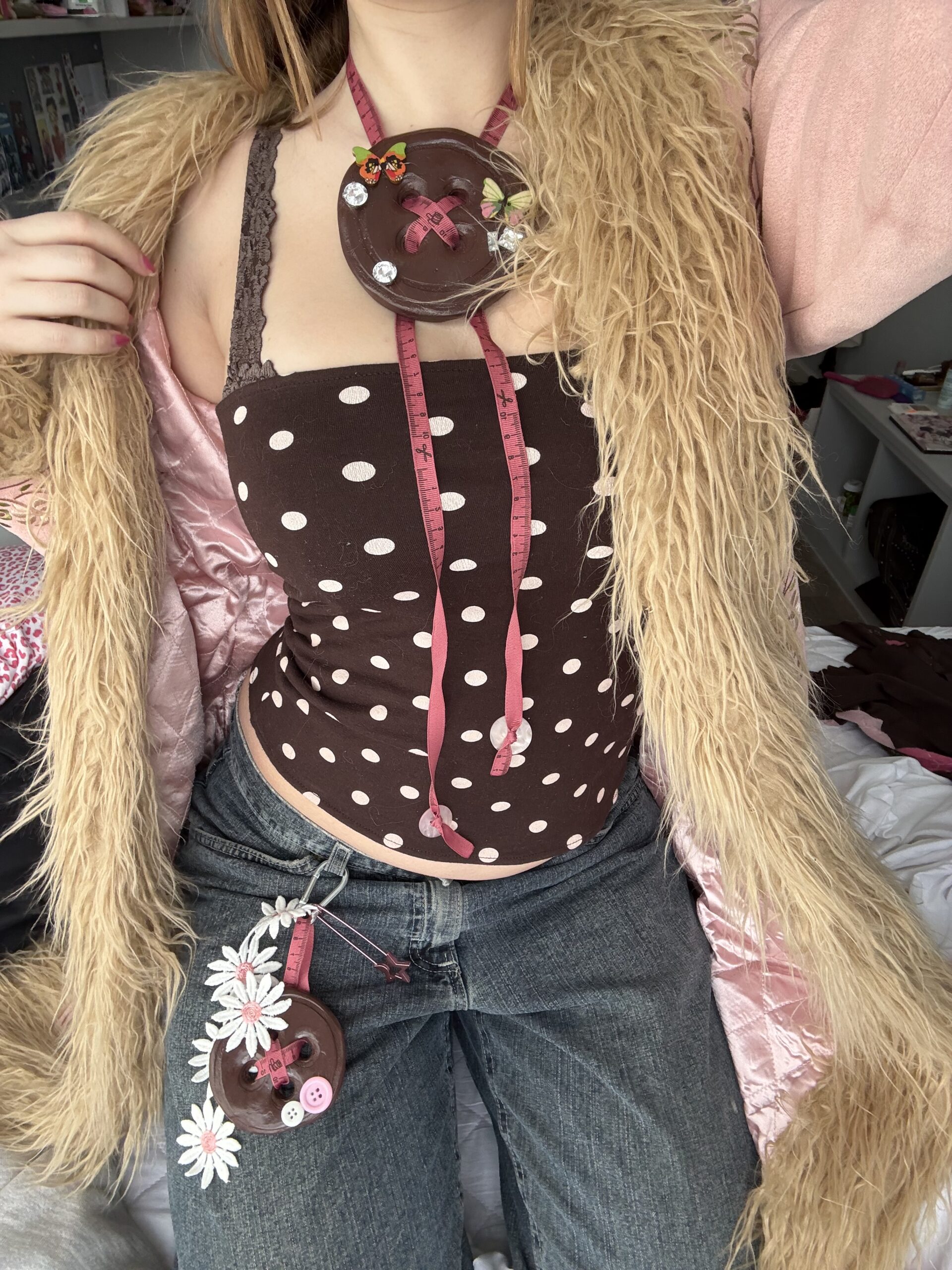 Bolero style necklace featuring handmade oversized button with butterfly appliqués and measuring tape ribbon sourced from Paris