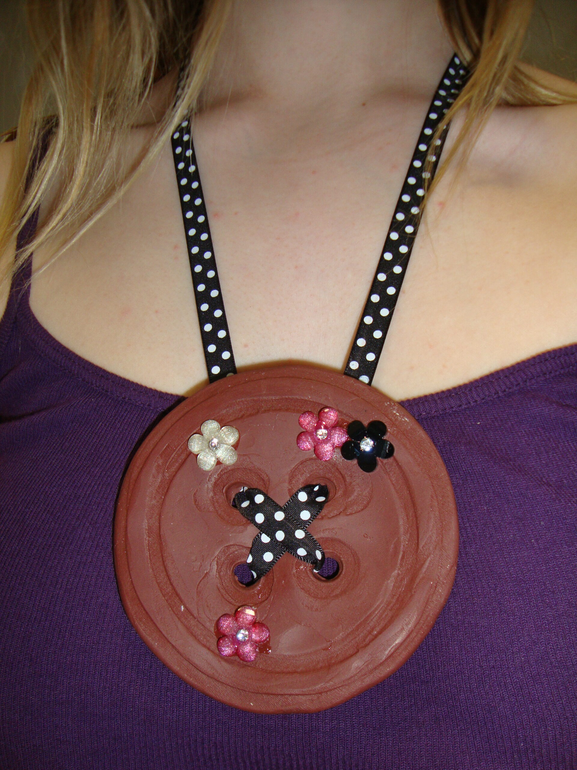 Necklace featuring handmade oversized button and flower appliqués