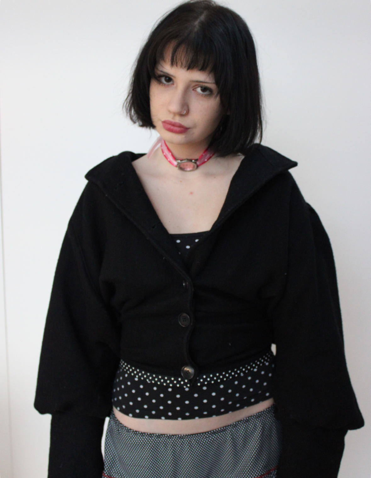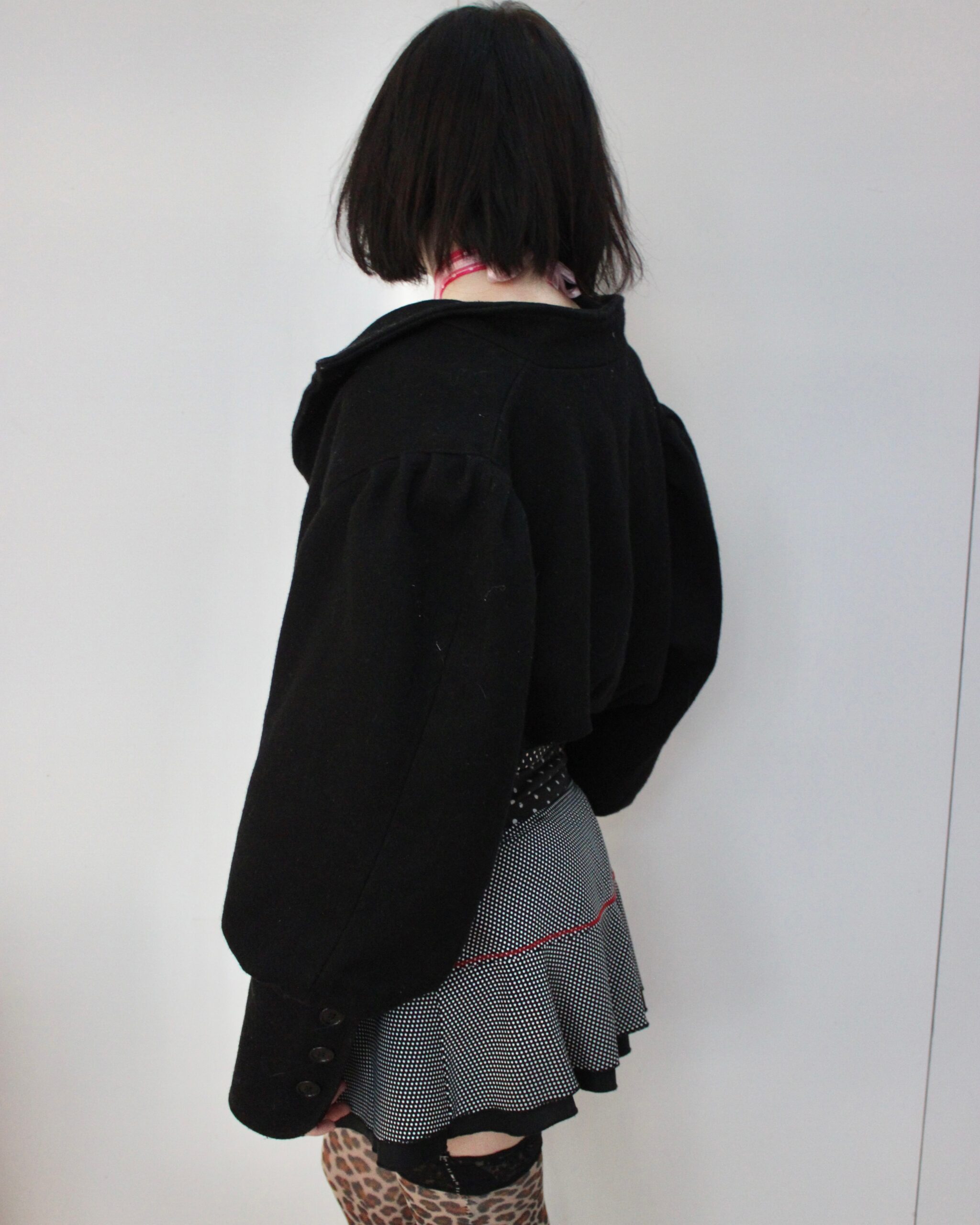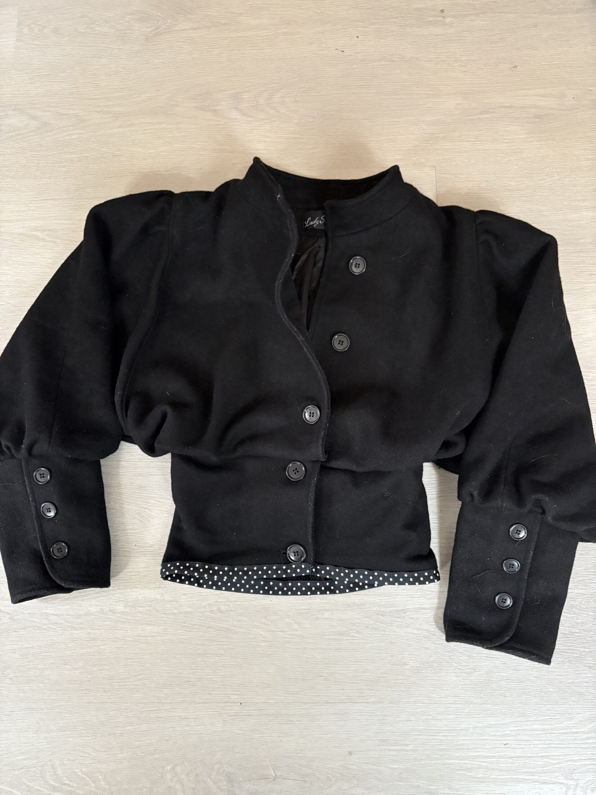Handmade up cycled jacket with cinched waist and polka dot trim