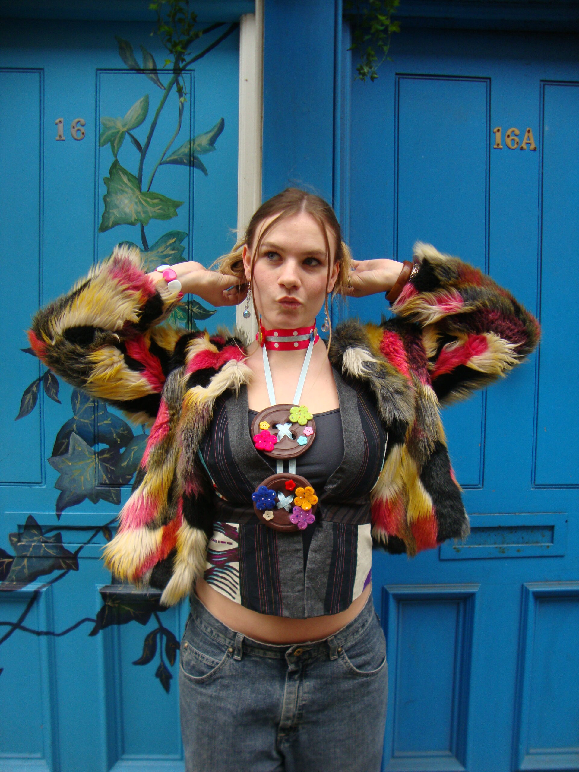 Handmade choker, featuring two buttons made from polymer clay with felt flower appliqués