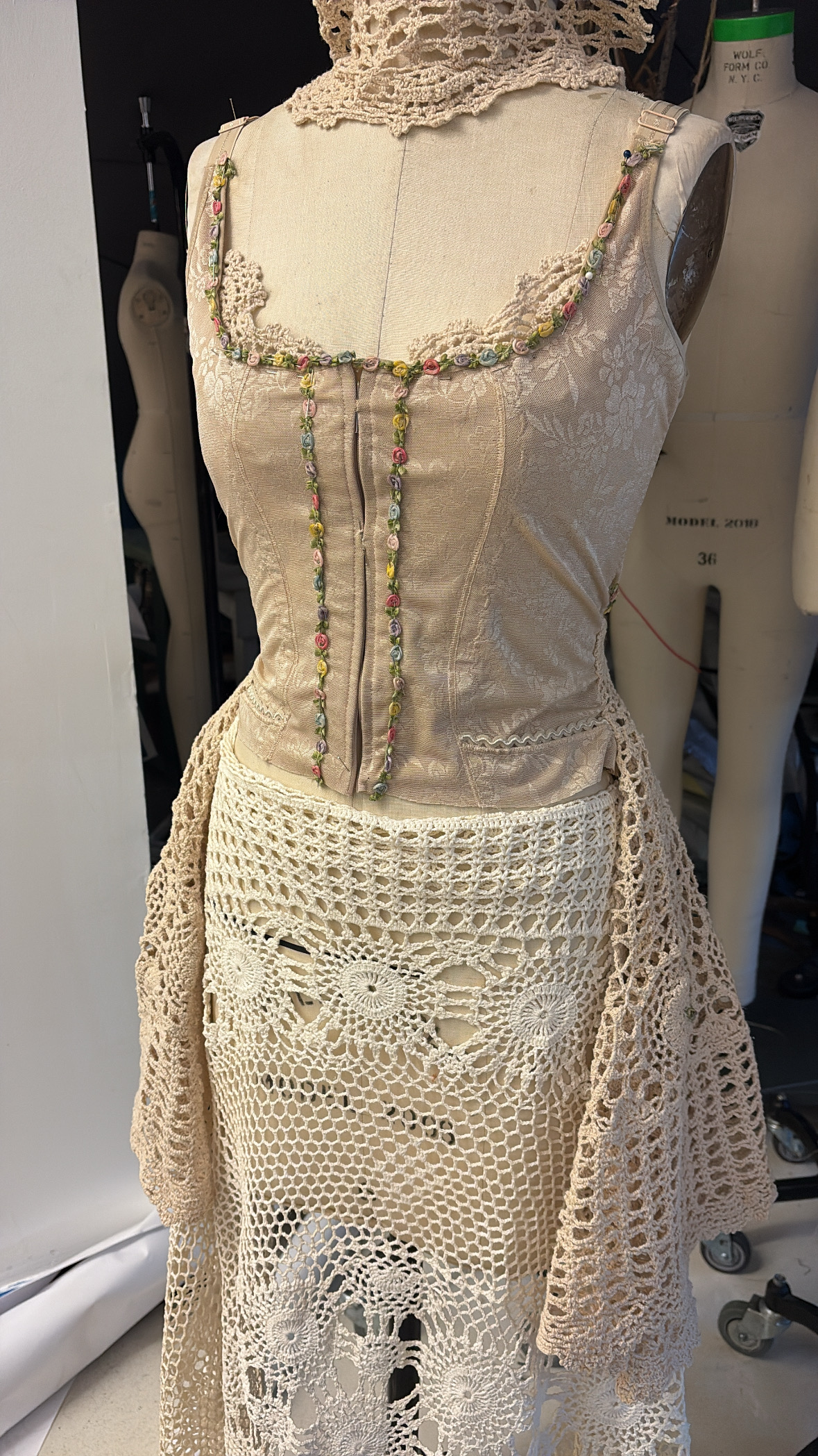 Handmade corset styled top, featuring floral trim detailing (from a vintage pillow) and crochet flare. Matching crochet skirt also included. Includes snap and zipper closure in front
