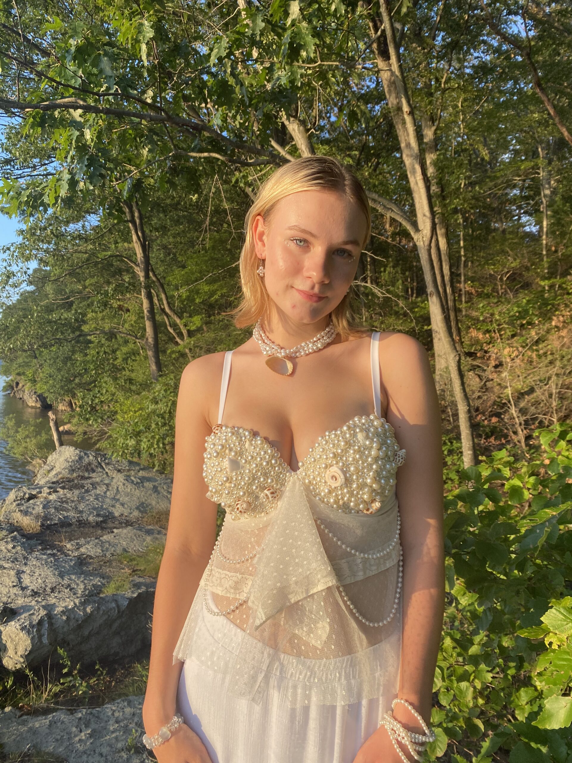 This handmade, mermaid inspired bra top features pearl beading and shells; each individually sewn