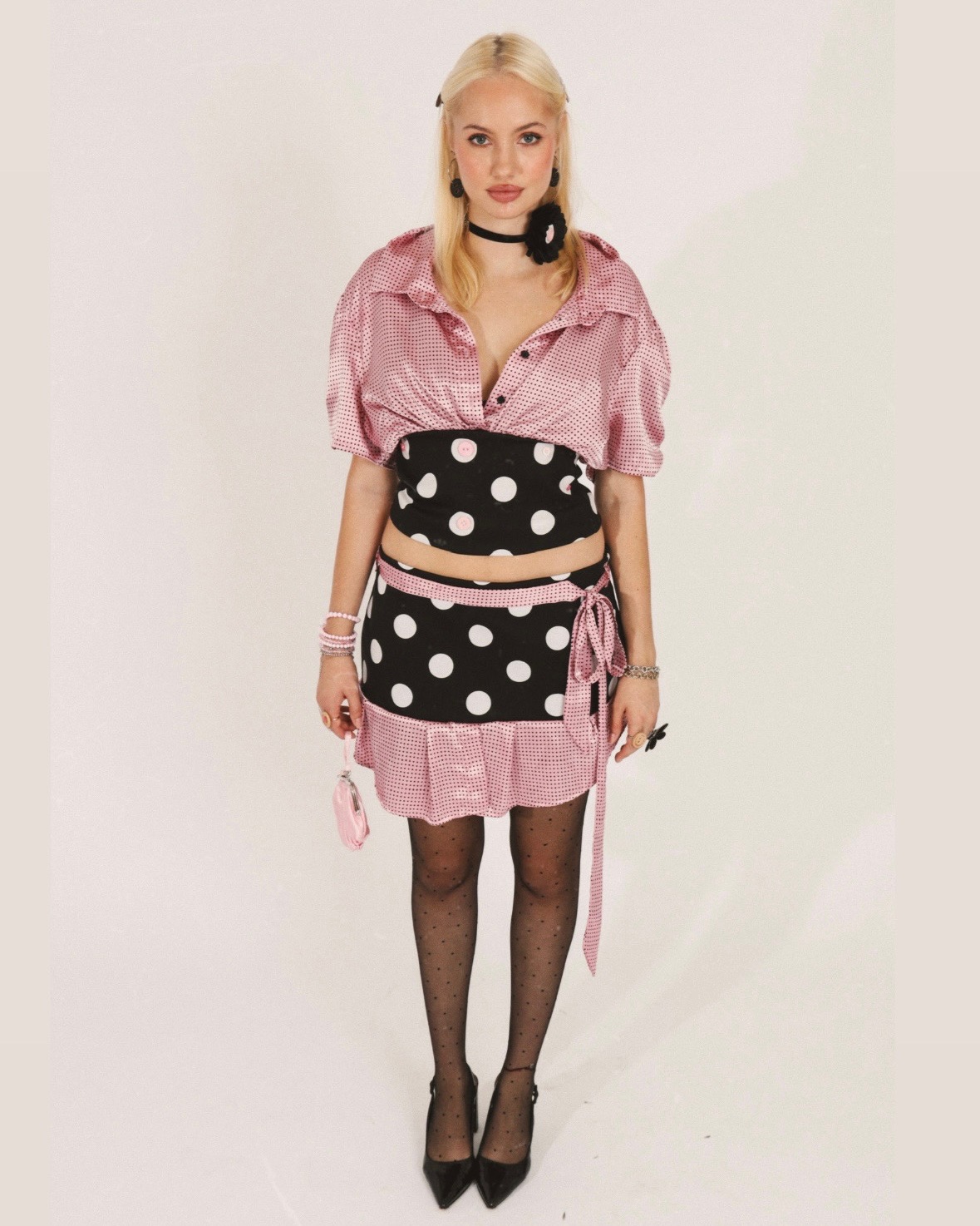 Model measurements: Height: 5’8″ Bust: 35″ Waist: 26″ Hips: 38″