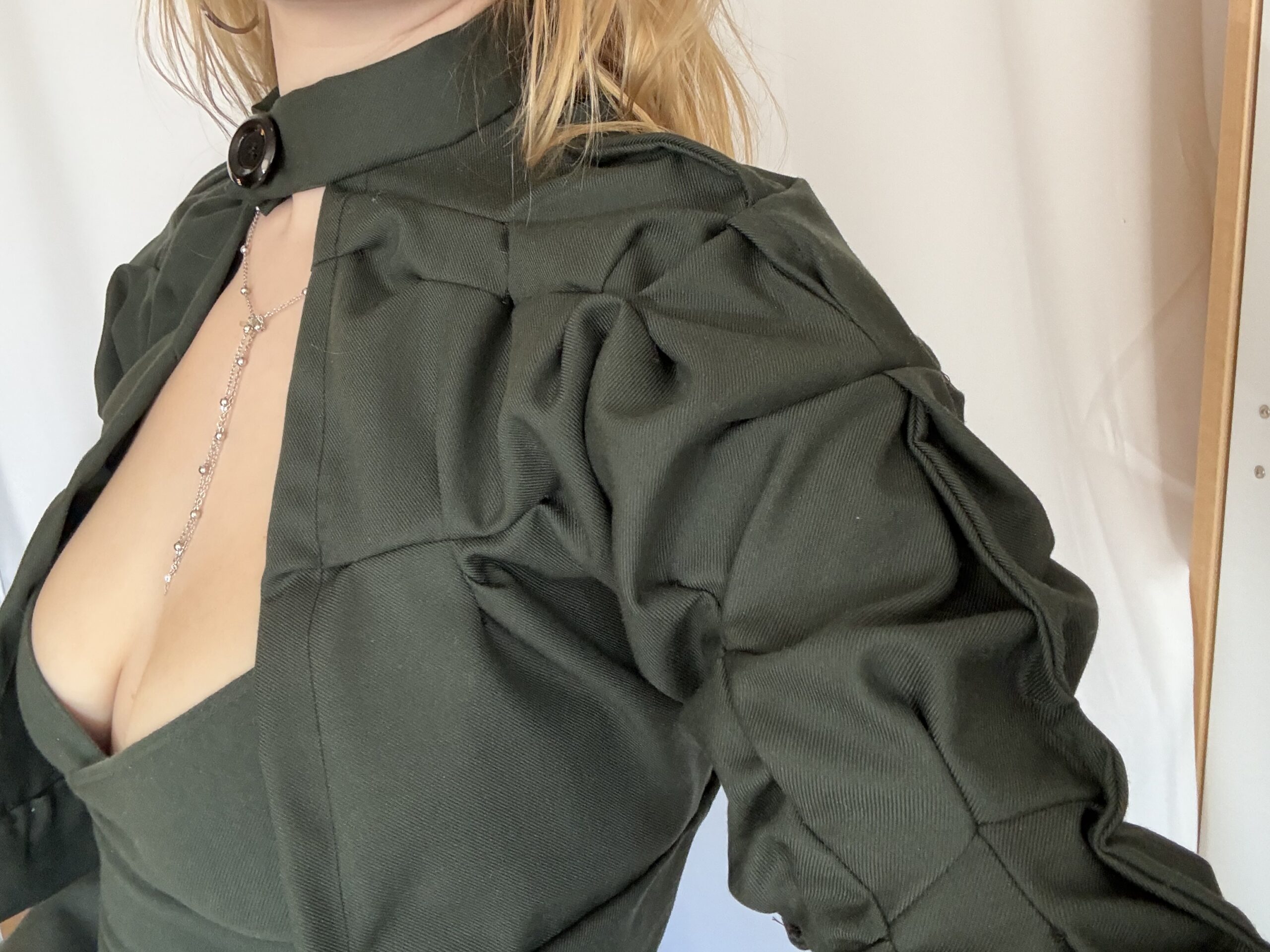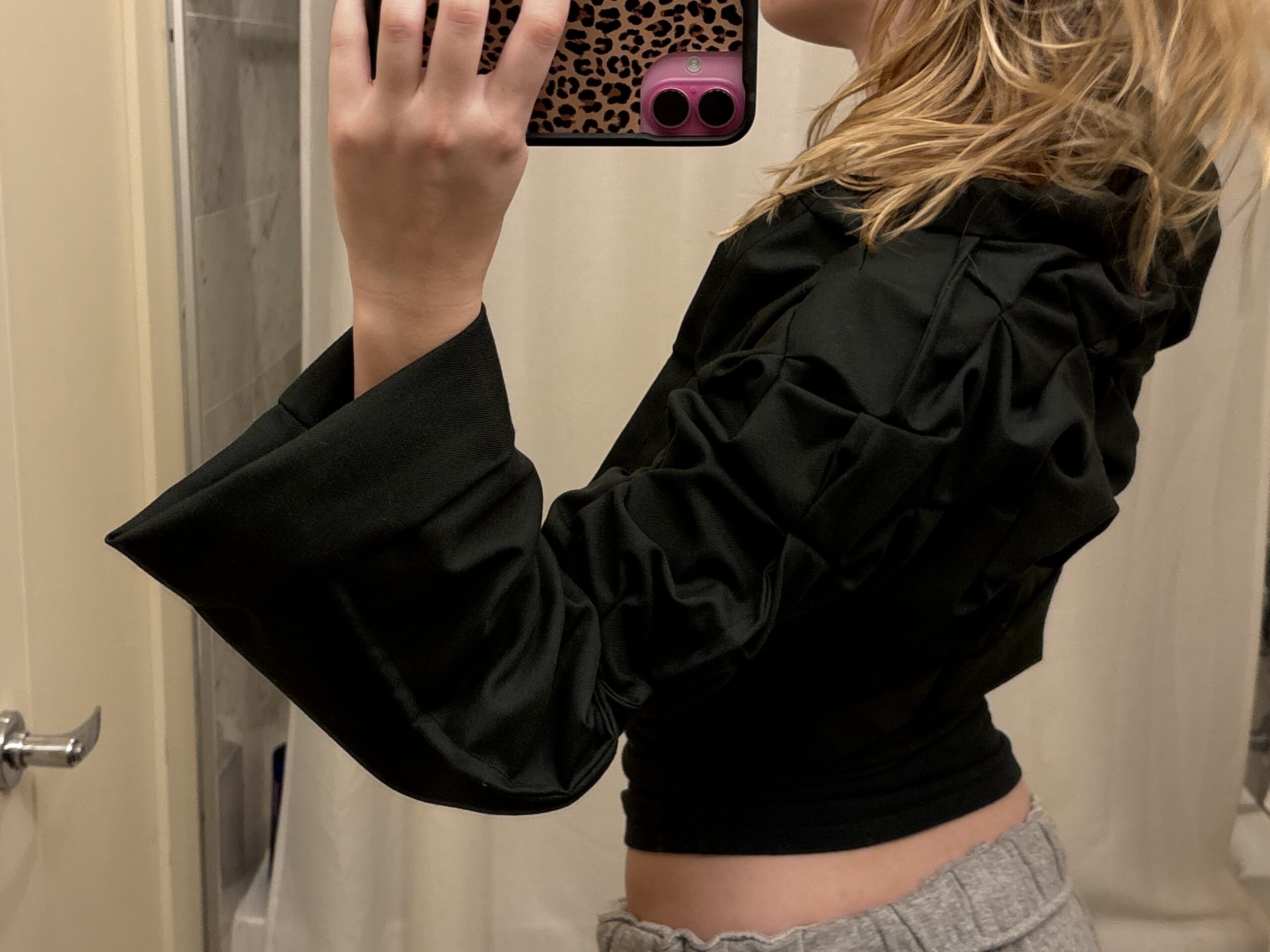 Had a lot of fun playing around with gathering on this mini jacket and strapless dress set. Jacket features a dolman sleeve, button closure on front, and gathering throughout back and sleeves. The matching dress also features gathers, as well as an elastic closure on top. Also recommend styling jacket with a tank and jeans!