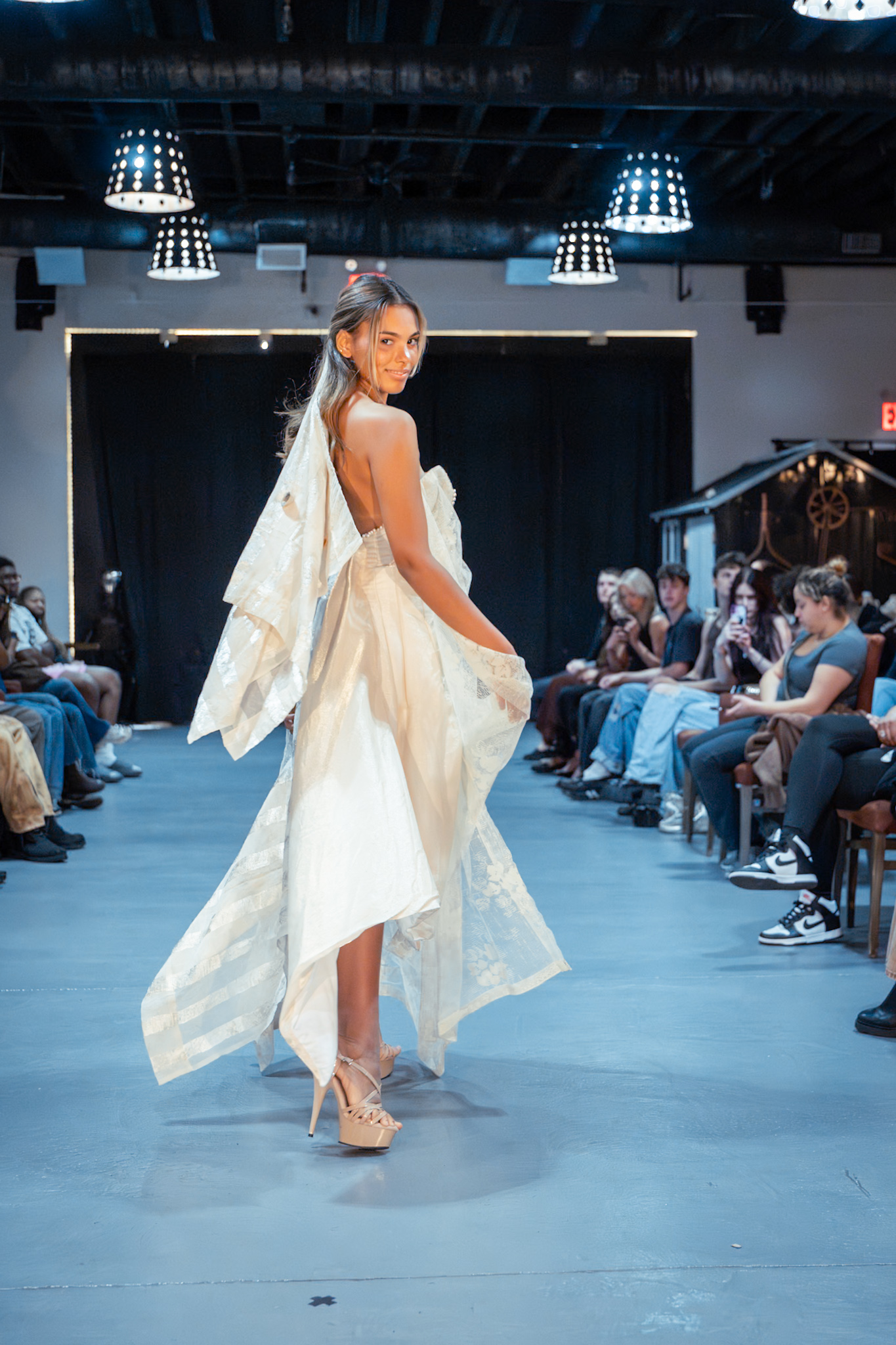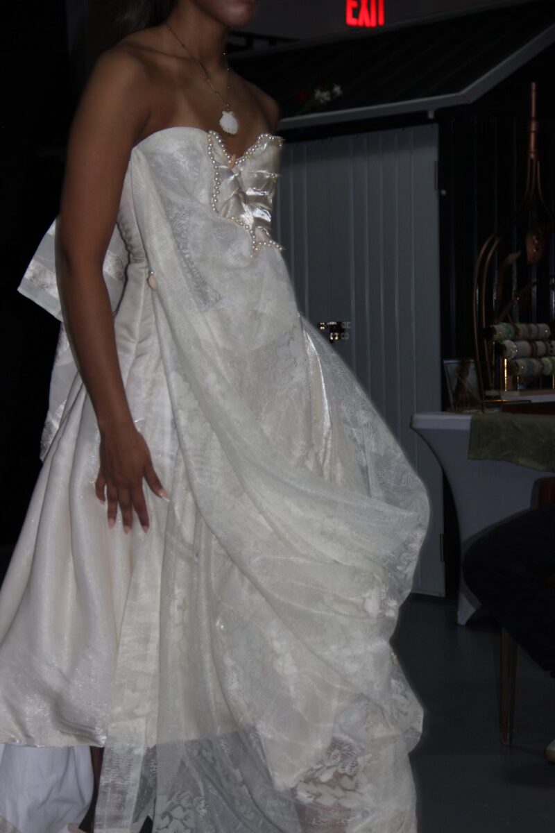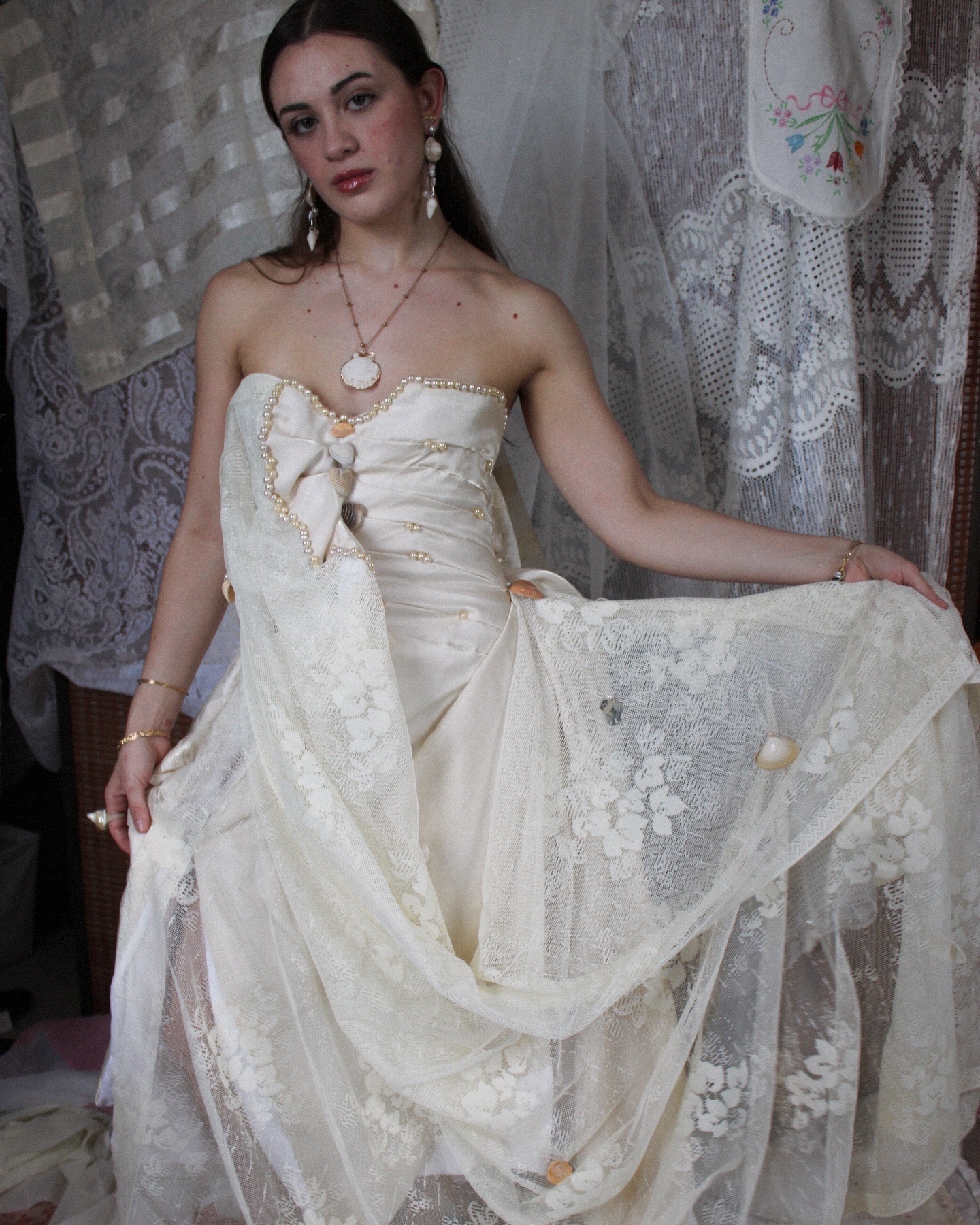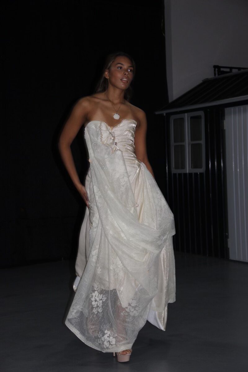This gown featured in Avant Garde Fusion’s 2025 Runway Show was handmade using vintage lace curtains, tablecloths, and glazed mercerized cotton. Featuring hand sewn embellishments of pearls and real seashells, as well as pleating to imitate a shell pattern; this mermaid-inspired bridal gown is perfect for a beach wedding.