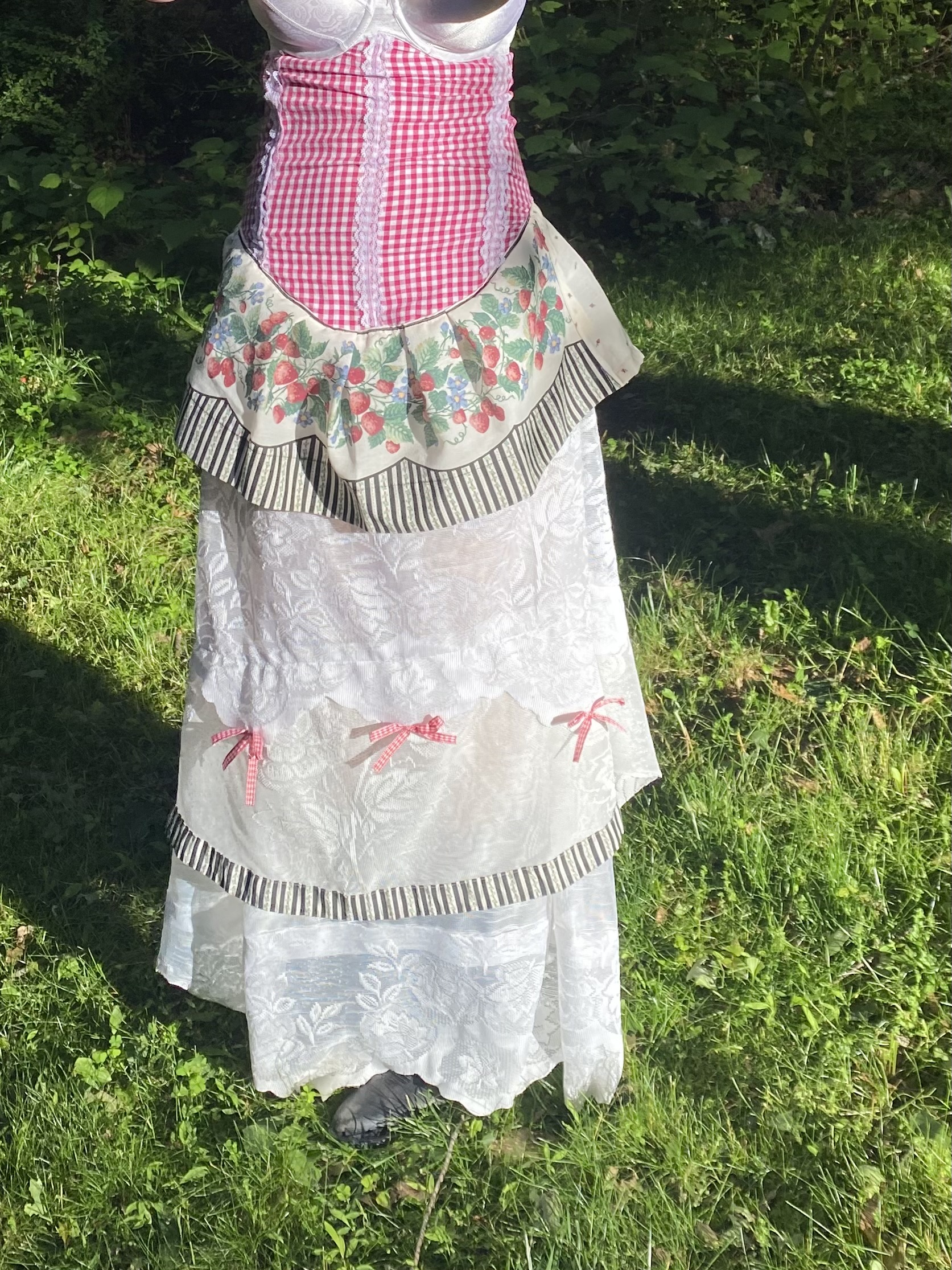 Handmade dress constructed using up cycled lace and strawberry decorated curtains