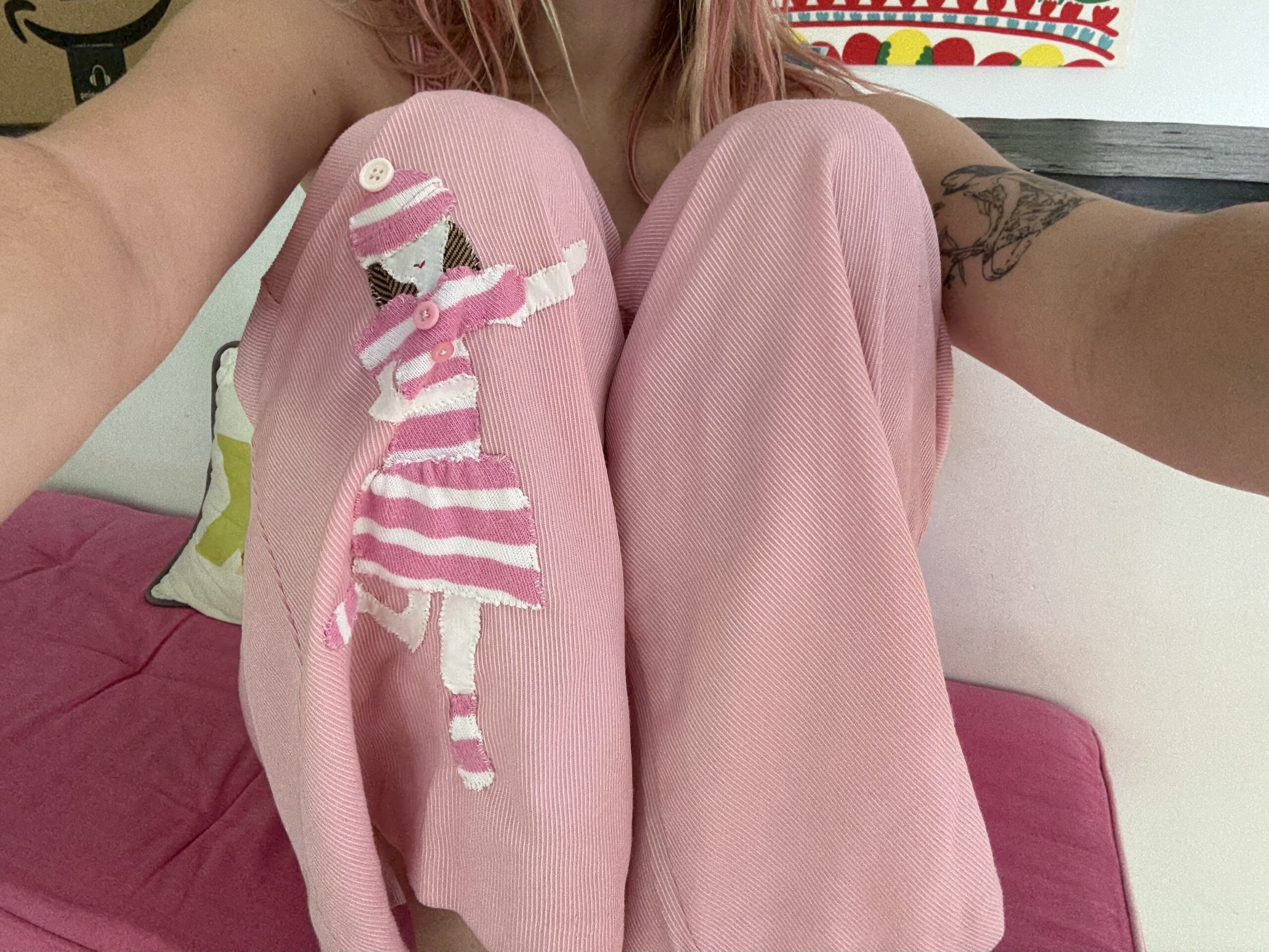 Pink trousers featuring a hand sewn design of a girl and her umbrella